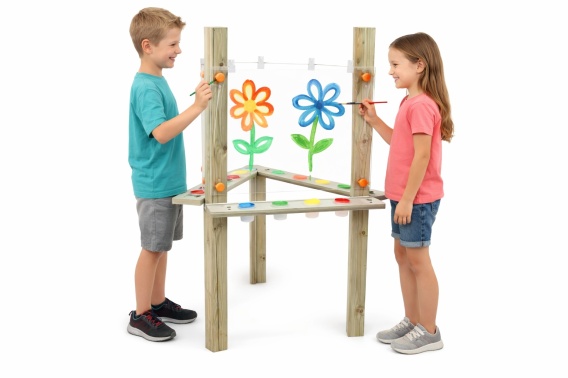 Wyposażona w duże, przezroczyste powierzchnie robocze, umożliwia malowanie farbami bezpośrednio na akrylu (tworząc witraże) lub tradycyjne rysowanie na papierze dzięki solidnym klipsom. Produkt wykonano z wysokiej jakości impregnowanego drewna sosnowego, co czyni go idealnym rozwiązaniem zarówno do sal przedszkolnych, jak i na plac zabaw czy do ogrodu.