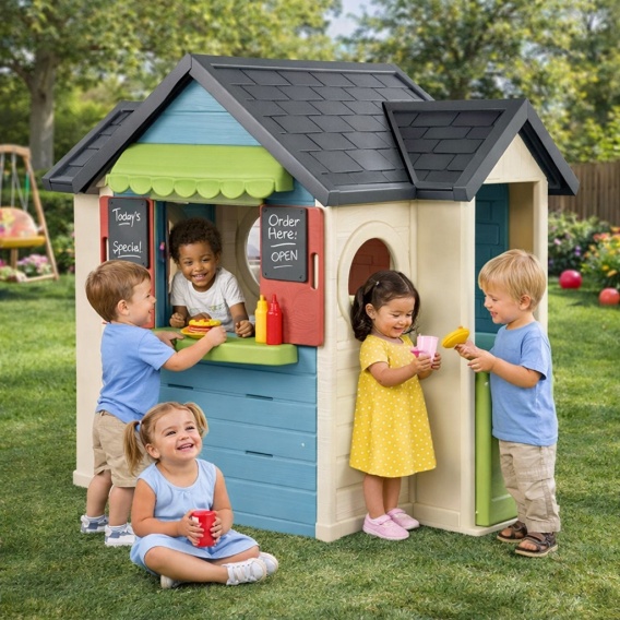 - Funkcjonalna kuchnia: Domek wyposażony jest w lodówkę, piekarnik, kuchenkę gazową, zlew z kranem oraz kasę fiskalną z czytnikiem kart. To prawdziwe zaplecze do zabawy w restaurację!