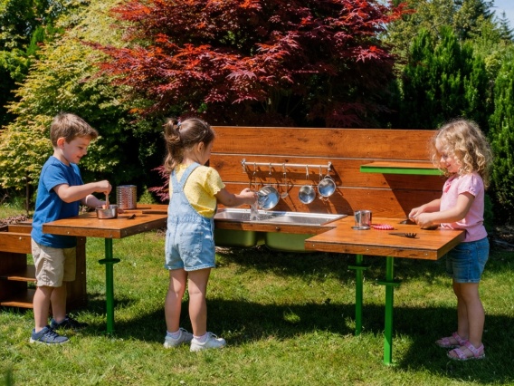 • Dwa duże blaty roboczne – znacznie większe niż w tradycyjnej kuchni błotnej – umożliwiającej pracę wielu dzieci jednocześnie