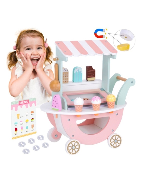 Uroczy drewniany wózek łączy w sobie funkcje lodziarni, cukierni oraz sklepu, zapewniając dzieciom wiele godzin kreatywnej i rozwijającej zabawy. Zestaw wyróżnia się bogatym wyposażeniem i dbałością o detale, oraz idealnie sprawdzi się do zabawy w odgrywanie ról i rozwijaniu wyobraźni.
