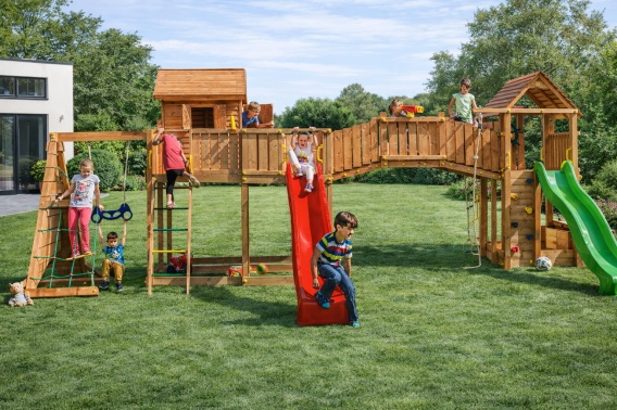Plac zabaw składa się z 2drewnianych domków z daszkiem, 2 zjeżdżalni, huśtawki, ścianki wspinaczkowej, drabinki metalowej i linowej, liny wspinaczkowej, mostu z lornetkąoraz schodów, co daje dzieciom miejsce i możliwości do wielogodzinnej zabawy na świeżym powietrzu. W zestawie znajdują się również: 2koła sterowe i luneta.