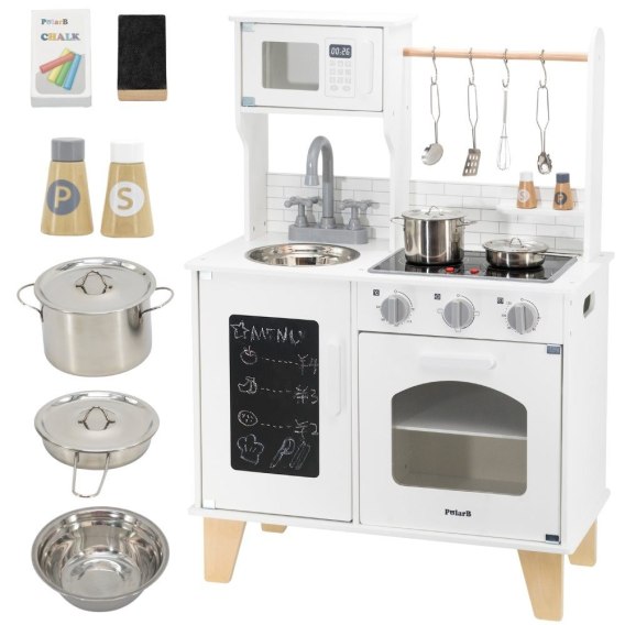 Drewniana kuchnia z tablicą od marki VIGA z serii PolarB to wymarzony mebel dla każdego małego kucharza i małej kucharki. Pozwala dzieciom naśladować dorosłych i wspólnie przygotowywać posiłki, łącząc naukę z doskonałą zabawą. Kuchnia została wyposażona w interaktywne detale, takie jak dźwięki gotowania i podświetlane palniki, a także pojemny zlew, piekarnik i frontową tablicę kredową idealną do rysowania oraz zapisywania ulubionych przepisów. Kuchenka znakomicie komponuje się z różnymi zestawami naczyń, stanowiąc wspaniałe zaplecze do kreatywnej zabawy w odgrywanie ról.