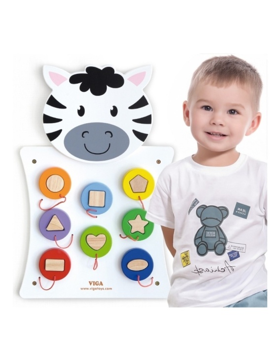 Drewniana Gra ścienna "Dopasuj kształty" Zebra od firmy Viga to jedna z czołowych zabawek, która pozwoli dziecku wejść do świata ciekawej i kreatywnej zabawy. Gra w formie sortera wyposażona jest w drewniane wypustki, na które należy umieścić odpowiedni kształt klocka na sznurku.