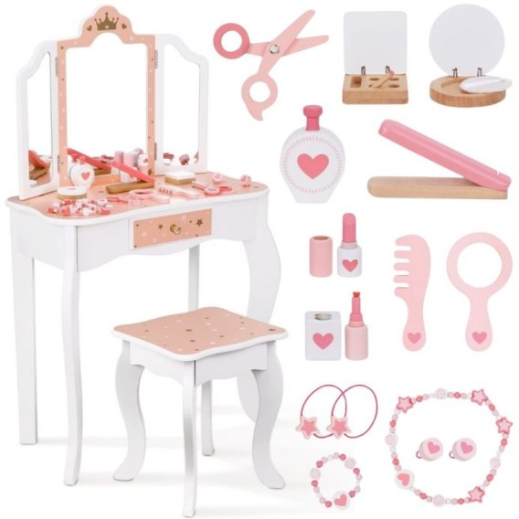 Drewniana toaletka z akcesoriami dla dzieci od Woopie Green to niezwykle urocza i dopracowana w każdym szczególe zabawka, która przenosi dzieci w świat wyobraźni, piękna i kreatywnej zabawy. Zaprojektowana z myślą o najmłodszych miłośniczkach stylu i estetyki, stanowi nie tylko piękny mebel do pokoju, ale również narzędzie wspierające rozwój emocjonalny, społeczny i manualny dziecka. Toaletka zachwyca eleganckim designem inspirowanym klasycznymi meblami dorosłych - ma kształt delikatnego biureczka z potrójnym lustrem, szufladką na drobiazgi i wygodnym stołeczkiem dopasowanym do wzrostu dziecka. Całość wykonana jest z wysokiej jakości drewna, pomalowanego bezpiecznymi, nietoksycznymi farbami w pastelowych odcieniach różu, bieli i złota. Każdy element został starannie oszlifowany, aby zapewnić bezpieczeństwo podczas zabawy. Zdobienia w postaci korony, serduszek i gwiazdek nadają toaletce bajkowego charakteru, sprawiając, że dziecko może poczuć się jak prawdziwa księżniczka lub artystka przygotowująca się do występu. Jej stylowy wygląd doskonale komponuje się z wystrojem dziecięcego pokoju - stanowi zarówno zabawkę, jak i elegancki element dekoracyjny. Toaletka wyposażona jest w praktyczną szufladkę, w której dziecko może przechowywać swoje skarby, biżuterię, akcesoria do włosów i kosmetyki do zabawy. Trzyczęściowe lustro z ruchomymi skrzydłami umożliwia przeglądanie się z różnych stron, a szeroki blat zapewnia dużo miejsca na wszystkie niezbędne dodatki. W zestawie znajduje się również bogaty komplet akcesoriów, dzięki którym zabawa staje się jeszcze bardziej realistyczna - wśród nich lusterko, grzebień, suszarka, cienie, lakier, pomadka, puder czy nawet drewniane perfumy. Dziecko może tworzyć własne stylizacje, ucząc się przy tym dokładności, cierpliwości i samodzielności.