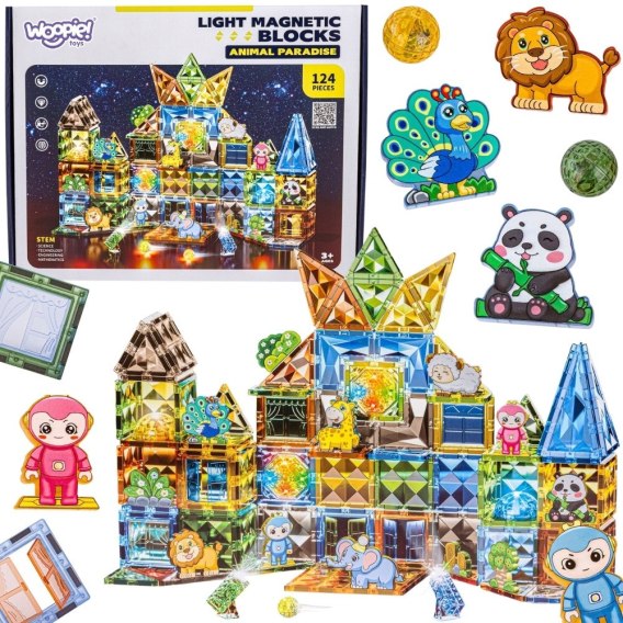 WOOPIE Klocki Magnetyczne Konstrukcyjne Świecące 3D Świat Zwierząt 124el.